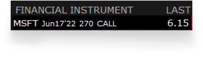 בתמונה – אופציית קול על מניית מיקרוסופט הצפויה לפקוע ב-17.06.2022, במחיר מימוש של $270, הפרמיה היא $615 (מחיר האופציה כפול מכפיל שהוא 100).